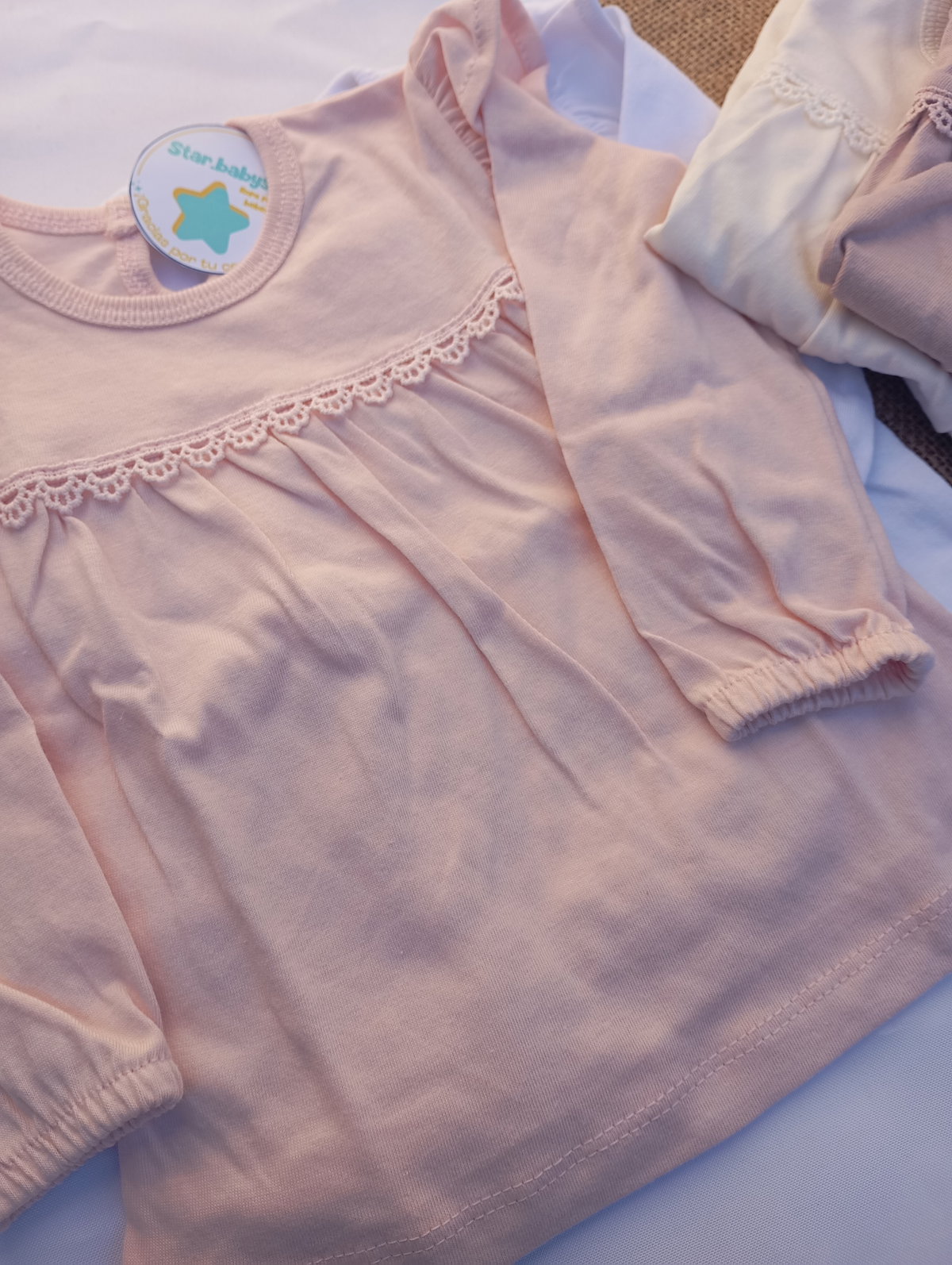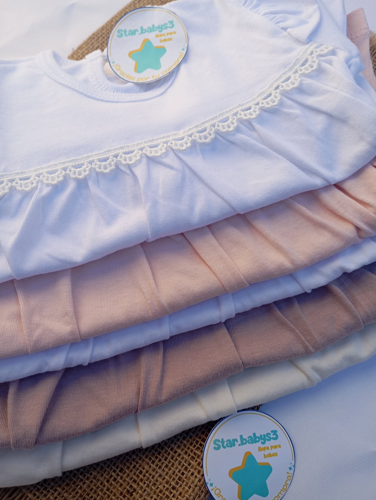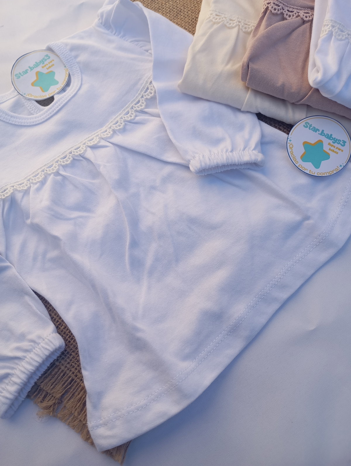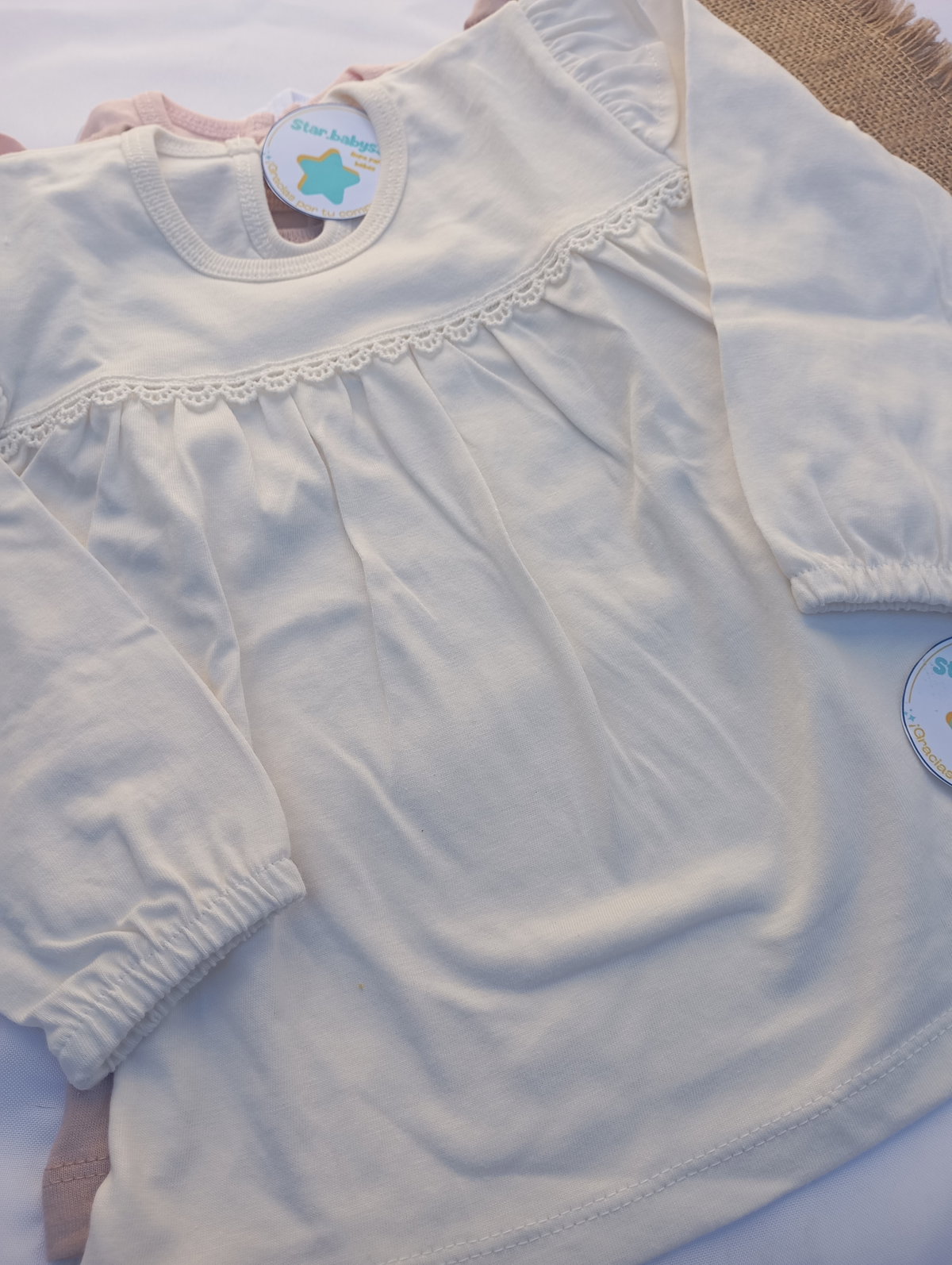 Hermosa camiseta de algod贸n con detalles de puntilla y el谩stico en los pu帽os